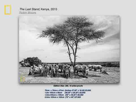The Last Stand, Kenya, 2015 Robin Moore Edition Size: 200, 10 artist proofs 70cm = 70cm x 47cm (inches 27.50" x 18.25) $3,000 1.0m 100cm x 66cm (39.25" x 26.25") $3,800 1.5m=150cm x 100cm (59" x 39.25”) $5,900 2.0m= 183cm x 122cm (72" x 48”) $7,900