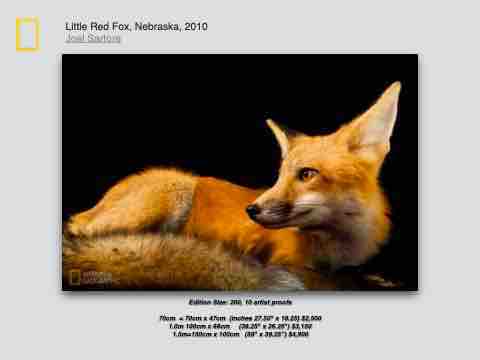 Little Red Fox, Nebraska, 2010 Joel Sartore Edition Size: 200, 10 artist proofs 70cm = 70cm x 47cm (inches 27.50" x 18.25) $2,500 1.0m 100cm x 66cm (39.25" x 26.25") $3,150 1.5m=150cm x 100cm (59" x 39.25”) $4,900