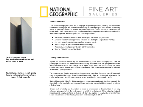The mounting and framing process is a time enduring procedure that takes several hours and must be completed by hand. Every National Geographic | Fine Art photograph is inspected for quality and accuracy of finish; thus ensuring we are providing the highest quality work.