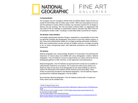 National Geographic | Fine Art Galleries has partnered with Trusted.com to establish an authentication method for our products. The Trusted.com eTitle process allows us to detail the origin of each piece of art photography we sell, while enabling our clients to confirm the authenticity and condition of their artwork at time of purchase. These eTitles are exclusively provided to new National Geographic | Fine Art Galleries artwork purchased from a National Geographic | Fine Art Gallery.