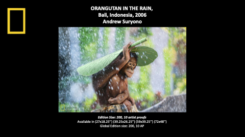 ORANGUTAN IN THE RAIN, Bali, Indonesia, 2006 Andrew Suryono Edition Size: 200, 10 artist proofs Available in (27x18.25’’) (39.25x26.25’’) (59x39.25’’) (72x48’’) Global Edition size: 200, 10 AP