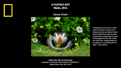 "Peeking from its burrow, a puffin snips off a bloom to dress up its temporary home on Skomer Island, where 6,000 pairs breed. Burrows usually extend several feet or more to keep egg and chick safe. Chicks are rarely seen, staying hidden for six weeks or so until flying off one night". -Danny Green