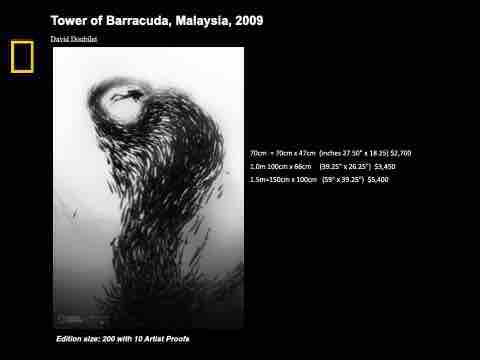 Tower of Barracuda, Malaysia, 2009 David Doubilet Edition size: 200 with 10 Artist Proofs 70cm = 70cm x 47cm (inches 27.50" x 18.25) $2,700 1.0m 100cm x 66cm (39.25" x 26.25") $3,450 1.5m=150cm x 100cm (59" x 39.25”) $5,400 2700 3450 5400