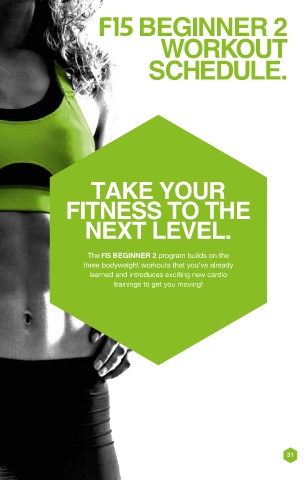 BEGINNER 2 WORKOUT SCHEDULE. TAKE YOUR FITNESS TO THE NEXT LEVEL. The BEGINNER 2 program builds on the three bodyweight workouts that you’ve already learned and introduces exciting new cardio trainings to get you moving! 31 31