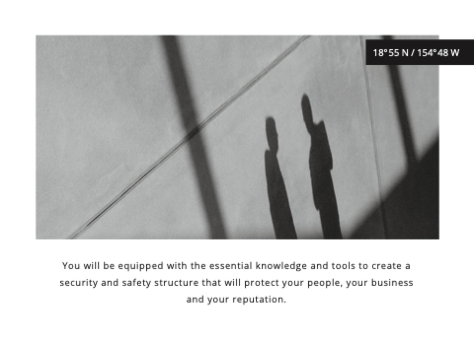 You will be equipped with the essential knowledge and tools to create a security and safety structure that will protect your people, your business and your reputation. 18° 55 N / 154° 48 W