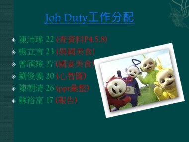 陳沛瑋 22 (查資料P4.5.8) 楊立言 23 (異國美食) 曾頎竣 27 (國宴美食) 劉俊義 20 (心智圖) 陳朝清 26 (ppt彙整) 蘇裕富 17 (報告)