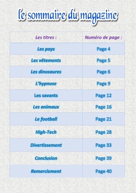 Les titres : Numéro de page : Les pays Page 4 Les vêtements Page 5 Les dinosaures Page 6 L’hypnose Page 9 Les savants Page 12 Les animaux Page 16 Le football Page 21 High-Tech Page 28 Divertissement Page 33 Conclusion Page 39 Remerciement Page 40