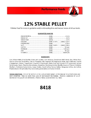 Pelleted feed for mares in gestation and/or at breeding time and mature horses of all use levels.