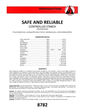 FEEDING DIRECTIONS: FEED SAFE AND RELIABLE – CONTROLLED STARCH AT A LEVEL THAT WILL MAINTAIN THE DESIRED BODY CONDITION AND