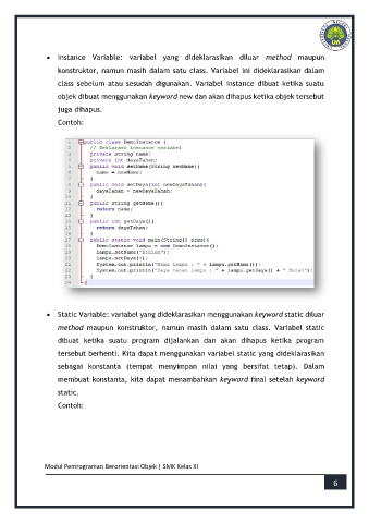 • Instance Variable: variabel yang dideklarasikan diluar method maupun