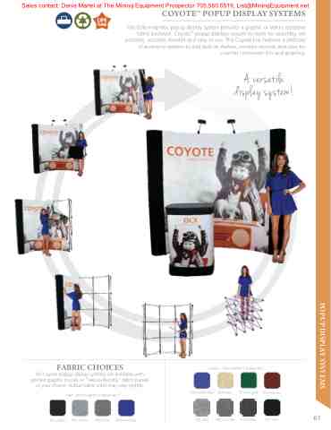 All Coyote popup display systems are available with printed graphic murals or “Velcro-friendly” fabric panels of your choice. Actual fabric color may vary slightly.