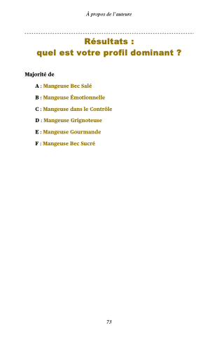 À propos de l’auteure Résultats : quel est votre profil dominant ? Majorité de A : Mangeuse Bec Salé B : Mangeuse Émotionnelle C : Mangeuse dans le Contrôle D : Mangeuse Grignoteuse E : Mangeuse Gourmande F : Mangeuse Bec Sucré 73