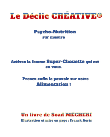 Le Déclic CRÉATIVE® Psycho-Nutrition sur mesure Activez la femme Super-Chouette qui est en vous. Prenez enfin le pouvoir sur votre Alimentation ! Un livre de Soad MÉCHERI Illustration et mise en page : Franck Aerts