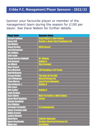 Cribbs F.C. Management/Player Sponsors - 2022/23