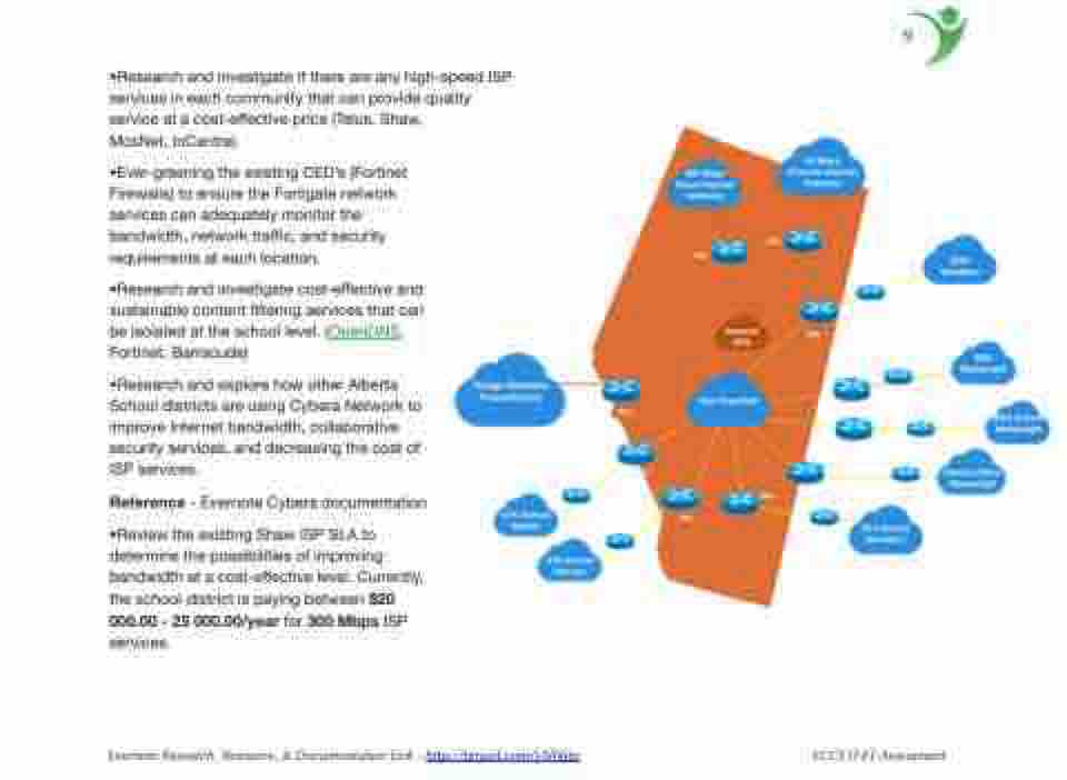 •Research and investigate if there are any high-speed ISP services in each community that can provide quality service at a cost-effective price (Telus, Shaw, McsNet, InCentre). •Ever-greening the existing CED’s (Fortinet Firewalls) to ensure the Fortigate network services can adequately monitor the bandwidth, network traffic, and security requirements at each location. •Research and investigate cost-effective and sustainable content filtering services that can be isolated at the school level. (OpenDNS, Fortinet, Barracuda) •Research and explore how other Alberta School districts are using Cybera Network to improve Internet bandwidth, collaborative security services, and decreasing the cost of ISP services. Reference - Evernote Cybera documentation •Review the existing Shaw ISP SLA to determine the possibilities of improving bandwidth at a cost-effective level. Currently, the school district is paying between $20 000.00 - 25 000.00/year for 300 Mbps ISP services. 9 Evernote Research, Resource, & Documentation Link - http://tinyurl.com/y5ff4jtq ECCS IT-ET Assessment