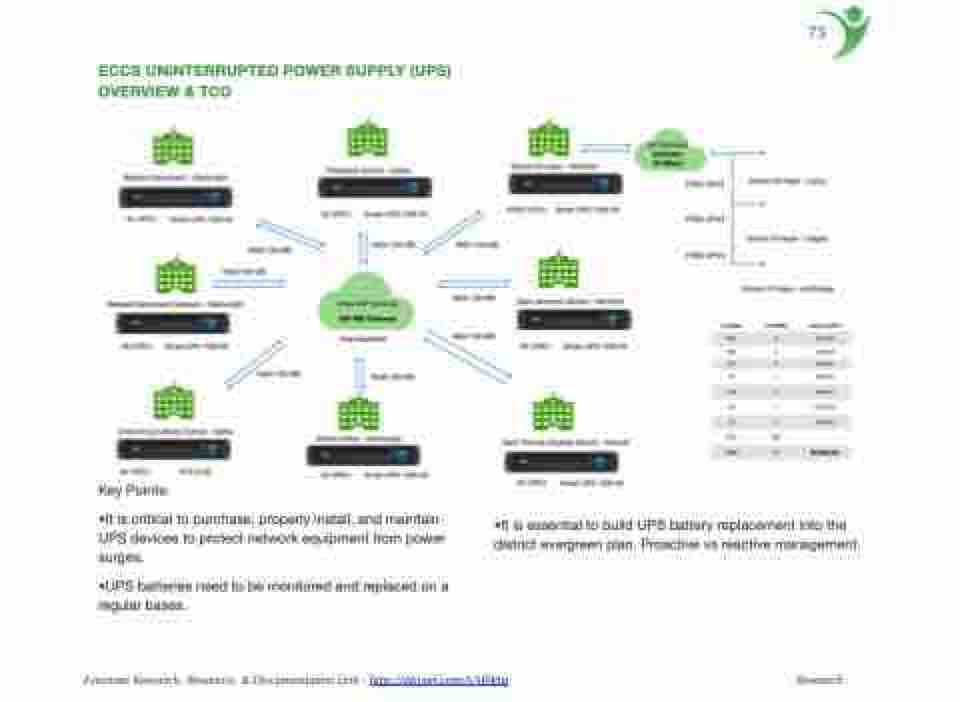 ECCS UNINTERRUPTED POWER SUPPLY (UPS) OVERVIEW & TCO Key Points: •It is critical to purchase, properly install, and maintain UPS devices to protect network equipment from power surges. •UPS batteries need to be monitored and replaced on a regular bases. •It is essential to build UPS battery replacement into the district evergreen plan. Proactive vs reactive management. 75 Evernote Research, Resource, & Documentation Link - http://tinyurl.com/y5ff4jtq Research