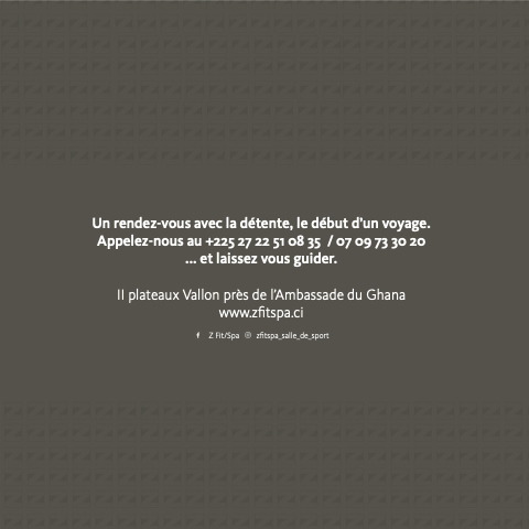 Un rendez-vous avec la détente, le début d’un voyage. Appelez-nous au +225 27 22 51 08 35 / 07 09 73 30 20 ... et laissez vous guider. II plateaux Vallon près de l’Ambassade du Ghana www.zfitspa.ci Z Fit/Spazfitspa_salle_de_sport