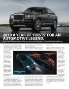 And 2019 will see the debut of two more – an elegant slider in the form of the limited edition “Black Badge Adamas Col- lection” of Wraiths and Dawns adorned with carbon ber and diamonds; and a Hall of Fame curve ball called Cullinan, the rst SUV in Rolls-Royce history -- and