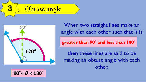 3 When two straight lines make an angle with each other such that it is greater than 90˚ and less than 180˚ then these lines are said to be making an obtuse angle with each other. 90˚< < 180˚
