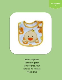 ACCESSORIES 22 Babero de pollitos Material: Algodón Color: Blanco, Azul Talla: de 3 a 4 meses Precio: $120