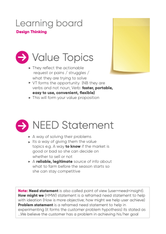 Note: Need statement is also called point of view (user+need+insight). How might we (HMW) statement is a reframed need statement to help with ideation (How is more objective; how might we help user achieve) Problem statement is a reframed need statement to help in experimenting (it forms the customer problem hypothesis) its stated as ...We believe the customer has a problem in achieving his/her goal
