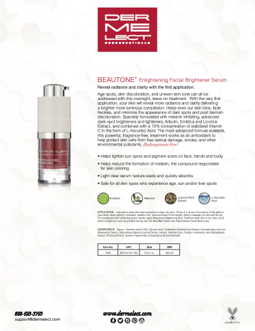 APPLICATION: Use before other skin care products on clean, dry skin. Pump 2-3 drops of the serum in the palm of your hand. Apply lightly to forehead, cheeks, chin, neck and back of the hands. Gently massage into skin and let dry. For accelerated skin whitening action results, apply Beautone Enlightening Spot Treatment after skin is dry. Stay out of direct sunlight as much as possible during use. For Dry Skin: follow with Rapid Repair Facial Moisturizer.