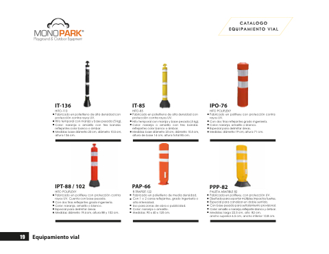 Con base pesada para señalamiento provisional. Color: amarillo o naranja, reflejante blanco y ámbar. Medidas: largo 22.3 cm, alto 82 cm.