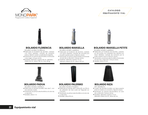 Fabricado en fundición de aluminio, soldado con micro alambre, vaciado de cemento para su fijacion al piso, puede llevar argollas. Terminado en pintura electrostática horneada color negro. Incluye ancla.