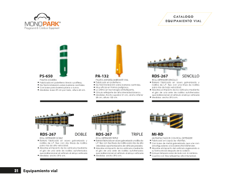 Absorbe el impacto de los vehículos mediante el giro de una serie de rodillos autofrenados que redireccionan el vehículo al arroyo vehicular. Medidas: ancho 39.5 cm.