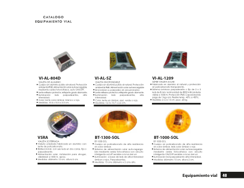 Cuerpo en policarbonato de alta resistencia en color ámbar, leds color ámbar o rojo. Sistema de alimentación solar autorecargable mediante celda fotovoltaica con circuito inteligente ON/OFF sensible a la luz del sol. Iluminación led parpadeante alta intensidad. Medidas: diámetro 10 cm, altura 2 cm.