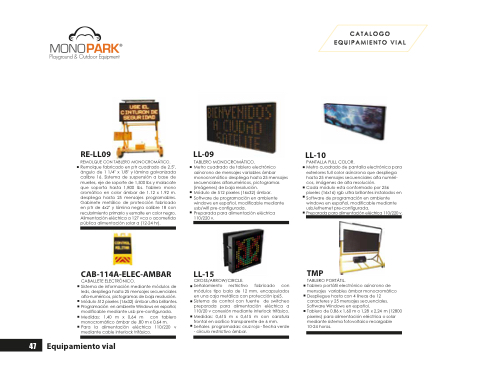 Metro cuadrado de tablero electrónico asíncrono de mensajes variables ámbar monocromático despliega hasta 25 mensajes secuenciales alfanuméricos, pictogramas (imágenes) de baja resolución.