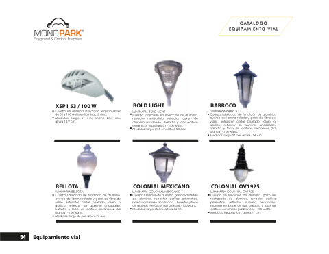 Cuerpo en fundición de aluminio, gorro de rechazado de aluminio, refractor acrílico prismático, reflector aluminio anodizado, montaje en poste de rizo, balastro y foco de aditivos cerámicos (luz blanca) - 100 watts. Medidas: largo 41 cm, altura 71 cm.