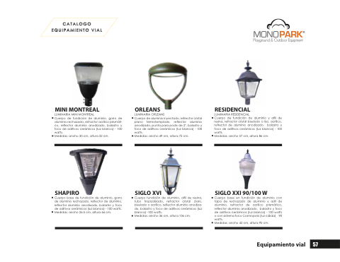 Cuerpo de fundición de aluminio y alfil de resina, refractor cristal biselado o liso, acrílico, refrector de aluminio anodizado, balastro y foco de aditivos cerámicos (luz blanca) - 100 watts.