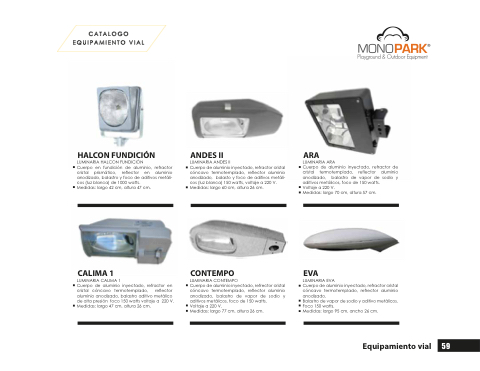 Cuerpo de aluminio inyectado, refractor cristal cóncavo termotemplado, reflector aluminio anodizado, balasto y foco de aditivos metáli- cos (luz blanca) 150 watts, voltaje a 220 V. Medidas: largo 60 cm, altura 26 cm.