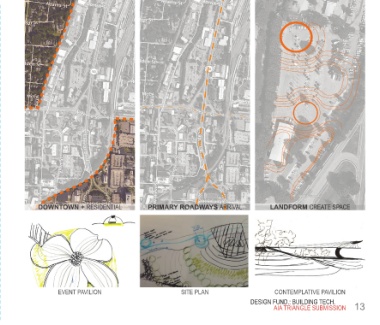 DOWNT PRIMARY ROADWAYS Y ROADWAYS ARRIVALARRIVAL DOWNTOWN + OWN + OWN + RESIDENTIAL PRIMAR LANDFORM CREATE SPACE DOWNT EVENT PAVILION SITE PLAN CONTEMPLATIVE PAVILION DESIGN FUND.: BUILDING TECH. AIA TRIANGLE SUBMISSION 13
