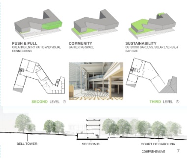 PUSH & PULL COMMUNITY SUSTAINABILITY CREATING ENTRY PATHS AND VISUAL GATHERING SPACE OUTDOOR GARDENS, SOLAR ENERGY, & CONNECTIONS DAYLIGHT UP UP DN DN DN SECOND LEVEL THIRD LEVEL BELL TOWER SECTION B COURT OF CAROLINA COMPREHENSIVE 7