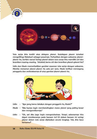 Udin dan Made memerhatikan gambar susunan tata surya dengan saksama.
