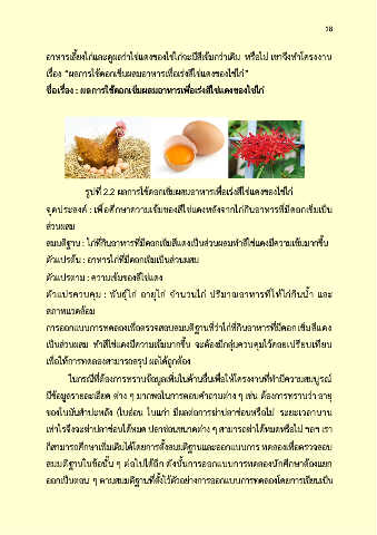 ชื่อเรื่อง : ผลการใช้ดอกเข็มผสมอาหารเพื่อเร่งสีไข่แดงของไข่ไก่
