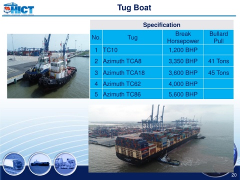 Tug Boat Specification Break Bullard No. Tug Horsepower Pull 1 TC10 1,200 BHP 2 Azimuth TCA8 3,350 BHP 41 Tons 3 Azimuth TCA18 3,600 BHP 45 Tons 4 Azimuth TC62 4,000 BHP 5 Azimuth TC86 5,600 BHP 20