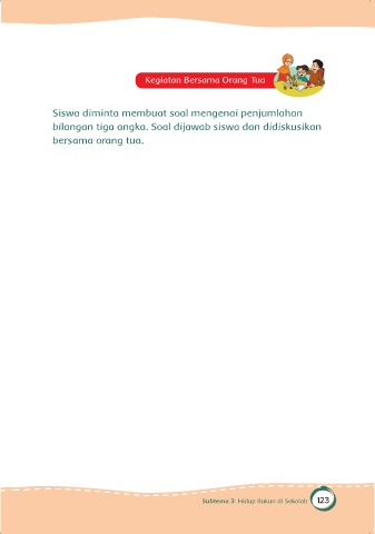 Kegiatan Bersama Orang Tua Siswa diminta membuat soal mengenai penjumlahan bilangan tiga angka. Soal dijawab siswa dan didiskusikan bersama orang tua. Subtema 3: Hidup Rukun di Sekolah 123
