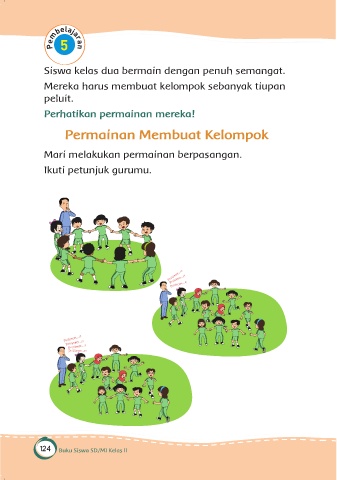 Siswa kelas dua bermain dengan penuh semangat. Mereka harus membuat kelompok sebanyak tiupan peluit. Perhatikan permainan mereka! Permainan Membuat Kelompok Mari melakukan permainan berpasangan. Ikuti petunjuk gurumu. 124 Buku Siswa SD/MI Kelas II