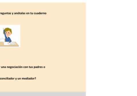 ➢ Responde a las siguientes preguntas y anótalas en tu cuaderno ¿Qué es un conflicto ? ¿Alguna vez has podido realizar una negociación con tus padres o maestros? ¿Cuál es la diferencia entre un conciliador y un mediador?