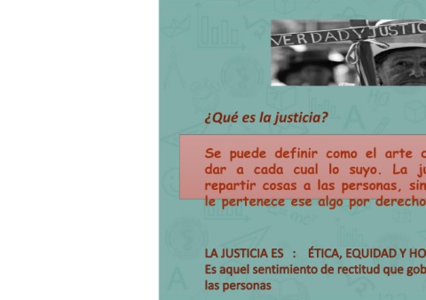 ¿Qué es la justicia? Se puede definir como el arte de hacer lo justo y de dar a cada cual lo suyo. La justicia NO es dar o repartir cosas a las personas, sino saber decidir a quién le pertenece ese algo por derecho. .