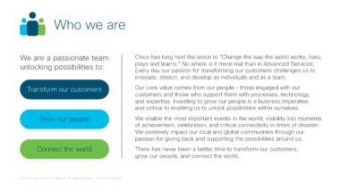 We are a passionate team Cisco has long held the vision to “Change the way the world works, lives,