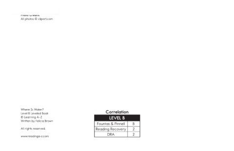 www.readinga-z.com   Fountas & Pinnell  Reading Recovery     www.readinga-z.com  All rights reserved.  Written by Felicia Brown  © Learning A–Z  Level B Leveled Book  Where Is Water?  All photos © clipart.com   Photo Credits: