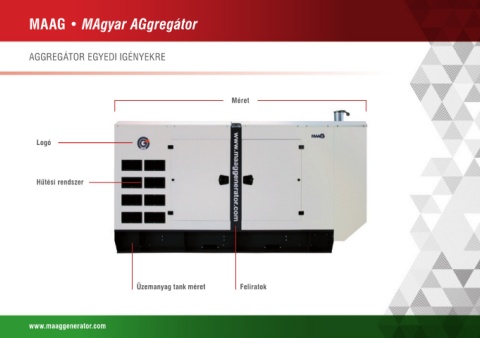 MAAG • MAgyar AGgregátor AGGREGÁTOR EGYEDI IGÉNYEKRE Méret Logó Hűtési rendszer Üzemanyag tank méret Feliratok www.maaggenerator.com