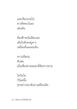 และเงียบหายไป ทางทิศตะวันตก เช่นเดิม ท้องฟ้าจะยังเรืองแสง เต็มไปด้วยหมู่ดาว เหมือนที่เธอเคยเห็น ความมืดมน สับสน เป็นเพียงม่ายหมอกที่ต้องจางหาย ไม่วันใด ก็วันหนึ่ง ทุกอย่างจะกลับมาเหมือนเดิม 102 103 102 ฉันกับบทกวีเป็นเพื่อนกัน