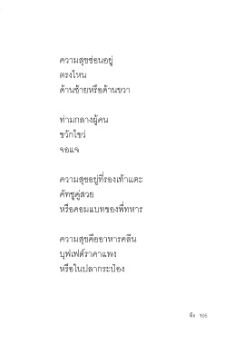 ความสุขซ่อนอยู่ ตรงไหน ด้านซ้ายหรือด้านขวา ท่ามกลางผู้คน ขวักไขว่ จอแจ ความสุขอยู่ที่รองเท้าแตะ คัทชูคู่สวย หรือคอมแบทของพี่ทหาร ความสุขคืออาหารคลีน บุฟเฟต์ราคาแพง หรือในปลากระป๋อง 105 104 พีร 105
