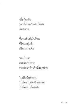 เมื่อท้องหิว โลกทั้งโลกก็พลันมืดมิด ล่มสลาย ที่เคยเย็นก็เป็นร้อน ที่ร้อนอยู่แล้ว ก็ร้อนกว่าเดิม หลับไม่ลง กระวนกระวาย ราวกับว่าข้าวคือสิ่งสุดท้าย ไม่เป็นอันท�างาน ไม่มีความคิดสร้างสรรค์ ไม่มีทางรักใครเป็น 135 134 พีร 135