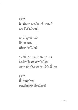 2017 โลกเดินทางมาเกือบครึ่งทางแล้ว และฉันยังเป็นหนุ่ม มนุษย์ทุกหมู่เหล่า มีอารยธรรม บริโภคเทคโนโลยี รัสเซียเป็นแนวหน้าคอมมิวนิวต์ อเมริกาถือธงประชาธิปไตย สงครามตะวันออกกลางยังไม่สิ้นสุด 2017 ที่ประเทศไทย รองเท้าบูทชุดเขียวน�าชาติ 167 166 พีร 167
